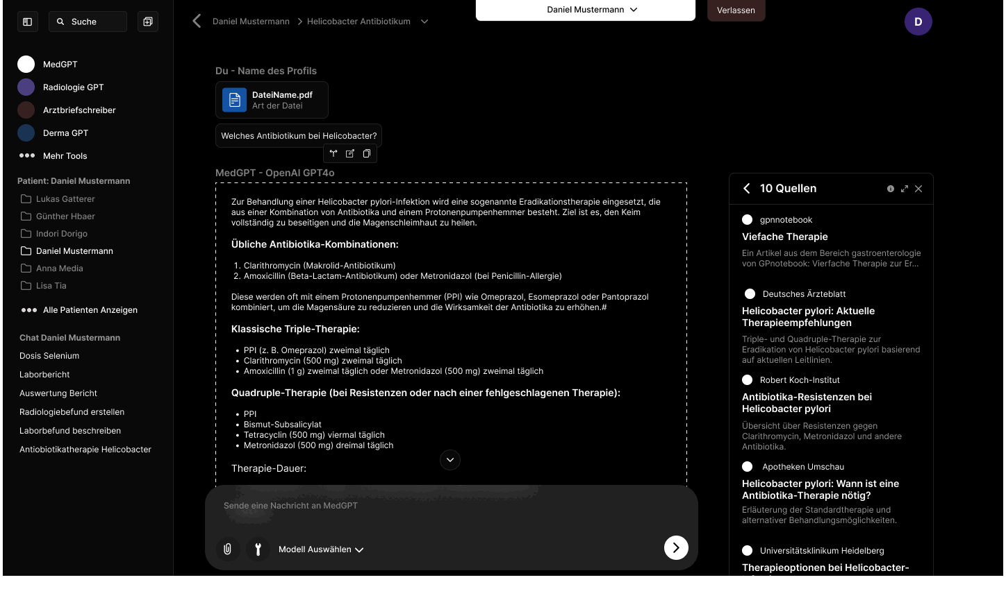 MedGPT: KI, die Ärzte unterstützt. Datenschutzkonform, patientenspezifisch, medizinisch präzise.