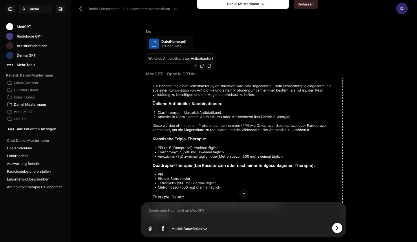 MedGPT ist der erste KI-Assistent speziell für Ärzte, der Ihnen patientenspezifische, DSGVO-konforme und effiziente Unterstützung bietet. Verschaffen Sie sich mehr Zeit für Ihre Patienten statt für Bürokratie.